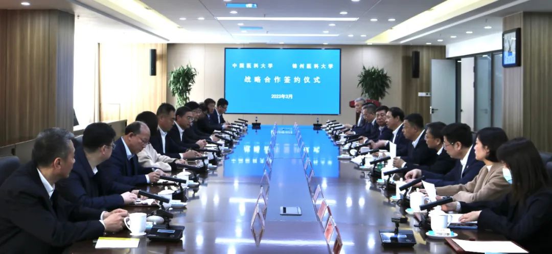 In order to jointly build a new collaborative education mode and achieve new breakthroughs in the innovative development of Jinzhou Medical University (JZMU),on March 9th, Wen Deliang, Secretary of the Party Committee of JZMU, led a team to China Medical University (CMU)to learn and exchange, and signed a strategic cooperation agreement with CMU. Gong Fuqing, Deputy Director of the Standing Committee of the Provincial People’s Congress and Secretary of the Party Committee of CMU, and Wang Zhenning, Vice-secretary of the Party Committee and President of CMU, attended the signing ceremony. Ding Weiguang, President and Vice-secretary of the Party Committee of JZMU, Qu Wei, Vice-secretary of the Party Committee, Zhang Lijuan, Vice-president and Standing Committee Member of the Party Committee, and administrators of relevant schools and departments of JZMU attended the ceremony.