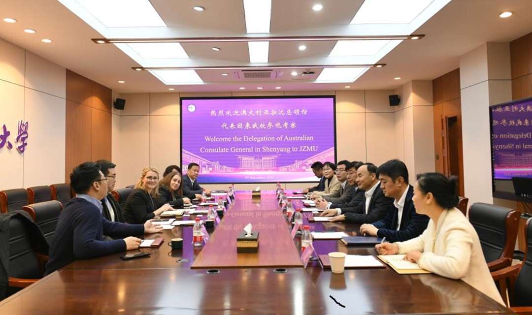On December 5th, the delegation led by the Acting Consul General of the Australian Consulate General in Shenyang, Medina and Consul Catia Rizio, visited JZMU. President Ding Weiguang and Vice President Sun Hongzhi welcomed and hosted the visiting guests in the academic seminar room of the library. The two sides had friendly exchanges and discussions on promoting cooperation between JZMU and Australian universities in the field of education, culture, and so on. Heads from the functional departments, School of Sports and Rehabilitation as well as School of International Education attended the meeting.