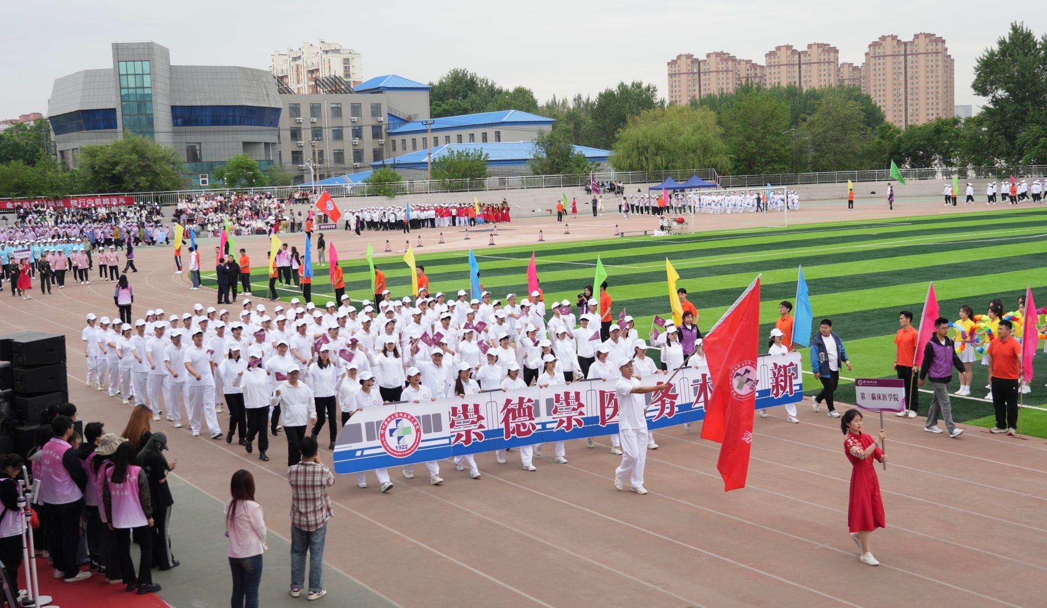 The majestic National Anthem of China was sung loudly by everyone and President Qu Wei delivered the opening speech afterwards. He stressed that there’s no champions to wait for, people only to strive for the success; he also hoped all the students and faculties could strive for higher, faster and stronger sportsmanship and consciously became the ‘Five Haves’ ones of Jinzhou Medical University, with all-round development of morality, intelligence, physical fitness, aesthetics and labor skills!
