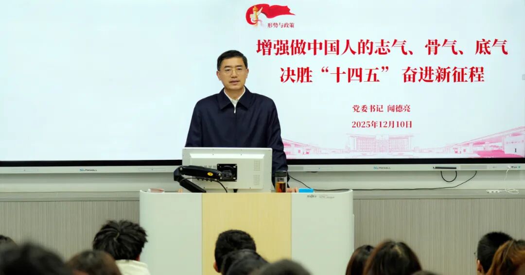 闻德亮以“2025年是中国人民抗日战争暨世界反法西斯战争胜利80周年,是中国共产党成立104周年”为切入点,以“增强做中国人的志气、骨气、底气,决胜‘十四五’奋进新征程”为题,围绕“中长期规划是我们党治国理政的重要方式”“‘十四五’收官之年的中国式实践成就答卷”“‘十四五’实践经验的核心要义与根本遵循”“‘十五五’规划开启奋进的新征途与新担当”“‘十四五’学校取得的成绩与展望”等五个方面展开深入讲解。他旁征博引,结合国内外形势,深入阐述党和国家事业发展、教育强国建设和健康中国建设的奋进征程,积极与学生互动交流,图文并茂、深入浅出地讲解让在场学生对坚定不移听党话、跟党走,砥砺新时代、奋进新征程,用实际行动做新时代好青年有了更为清晰的认识和共鸣。