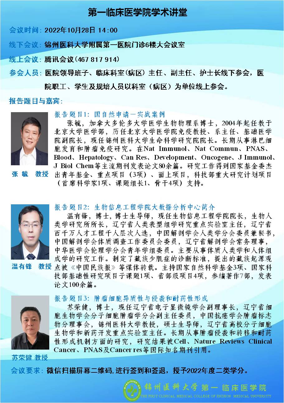 为营造学术氛围,提升学术交流质量,10月28日,由学校主办,口腔医学院、基础医学院、第一临床医学院、生物信息工程学院承办的学术讲堂如期举行,届时多名专家将为大家带来精彩的学术讲座,希望全校师生踊跃参加!