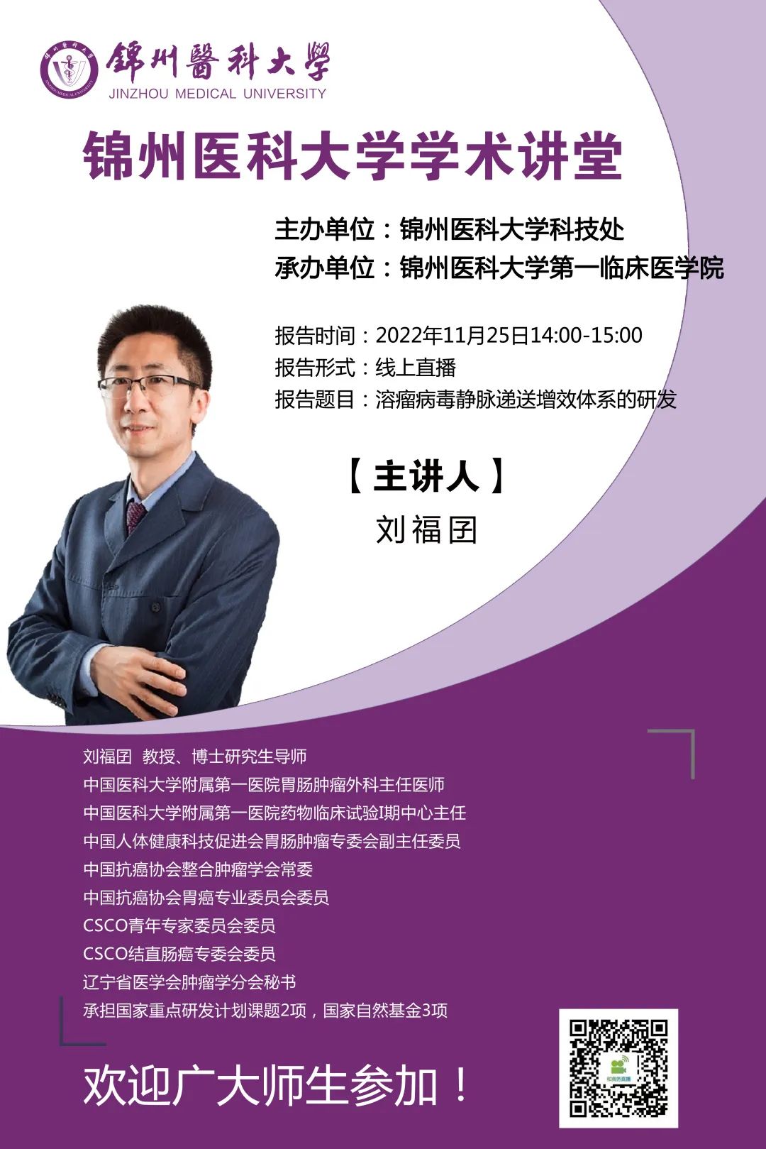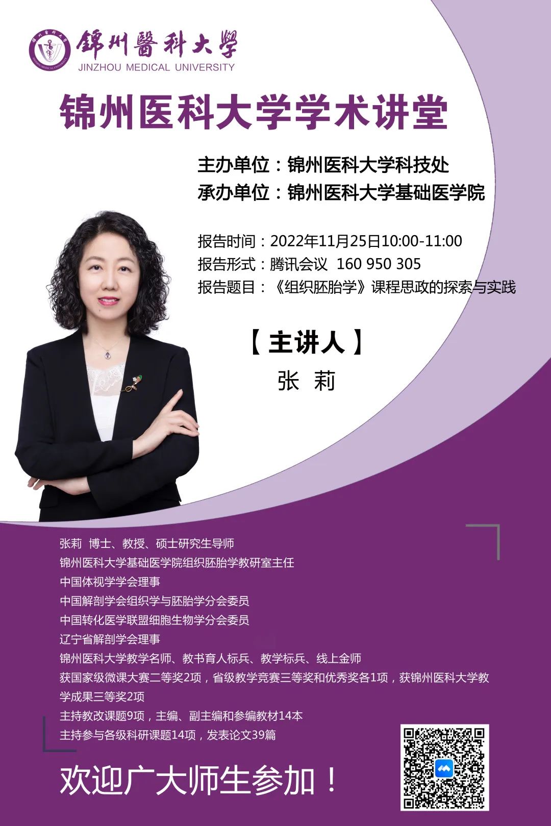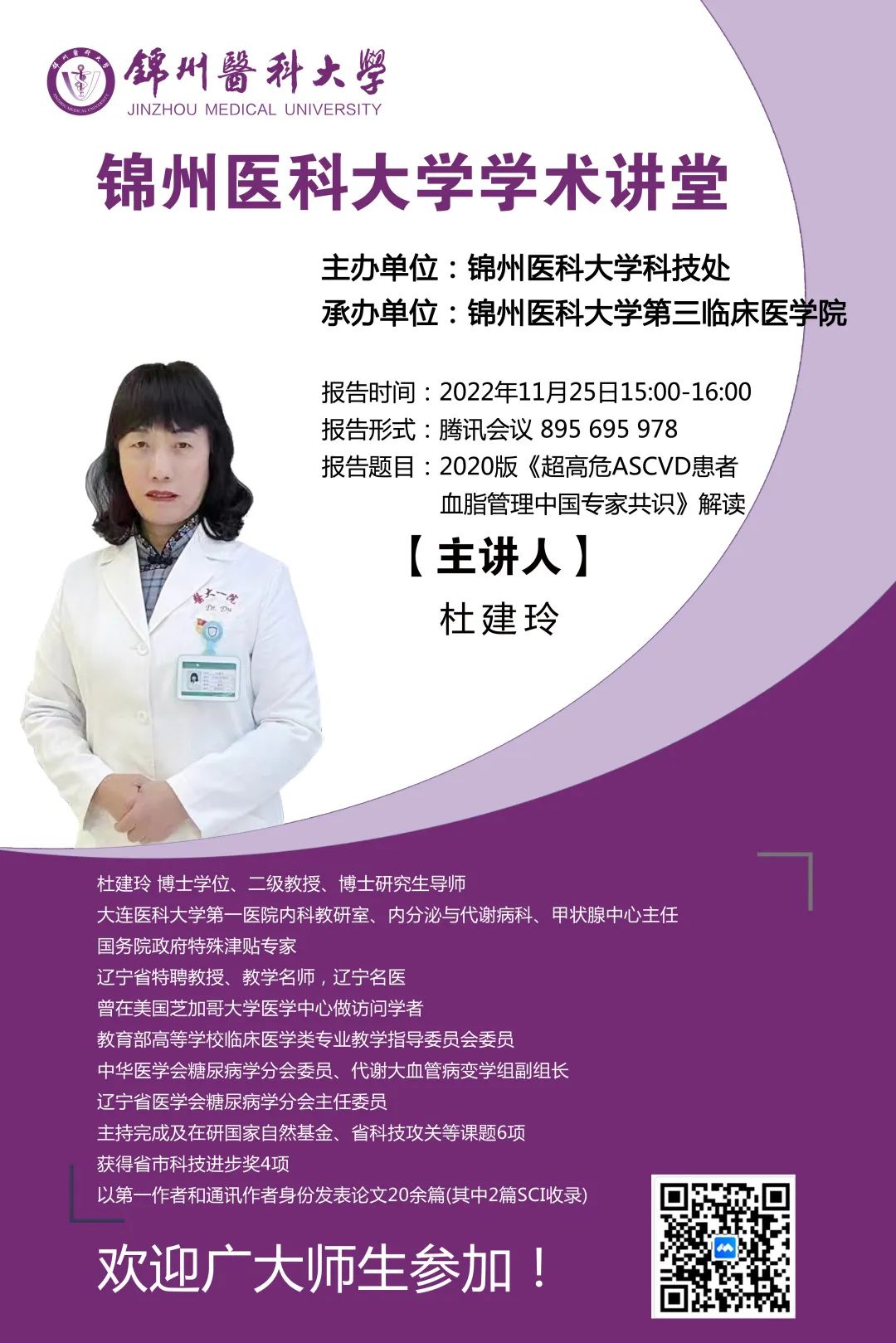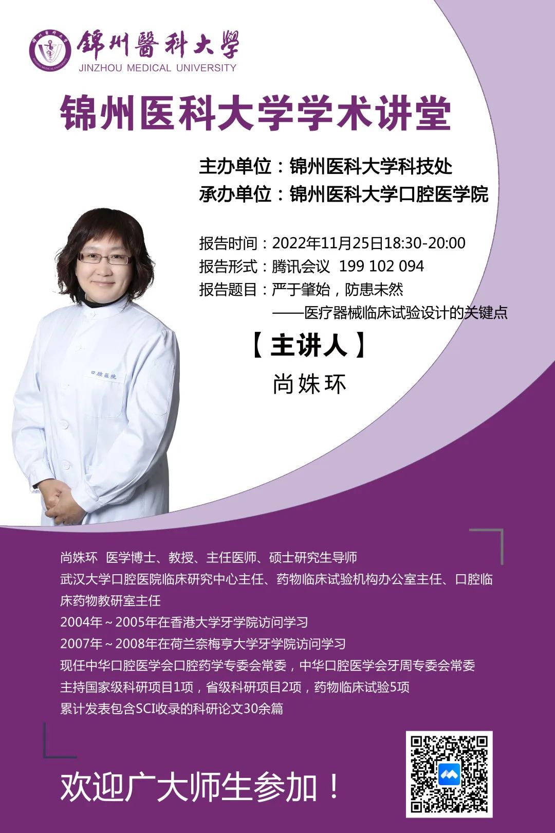 为营造学术氛围,加强学术交流,11月25日,由学校主办,基础医学院、第一临床医学院、第三临床医学院、口腔医学院承办的学术讲堂如期举行,届时多名专家将为大家带来精彩的学术讲座,希望全校师生踊跃参加!