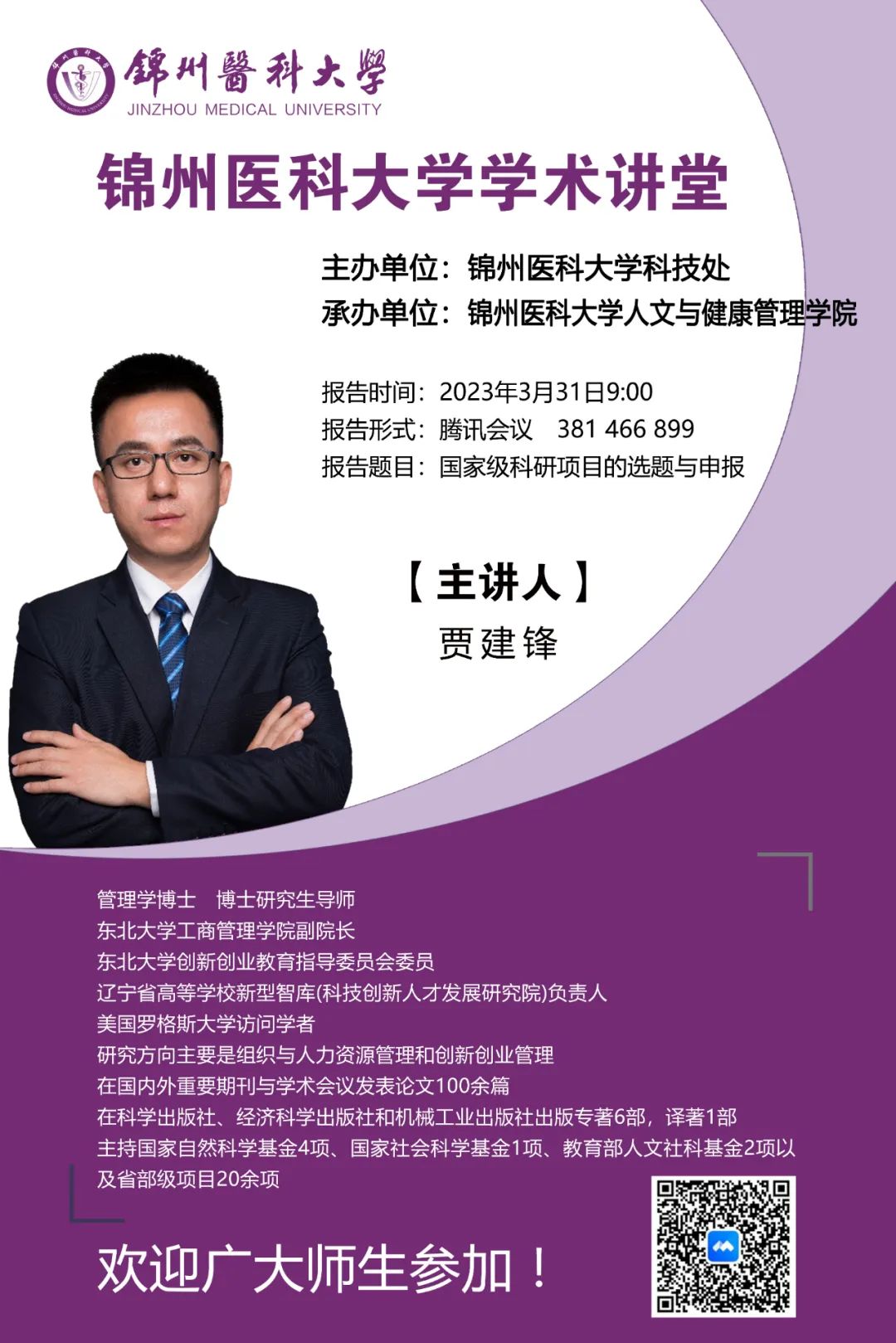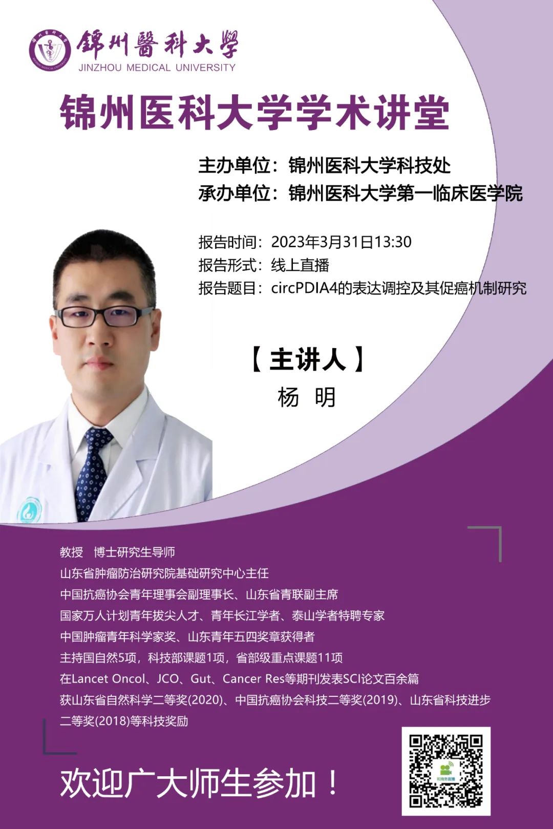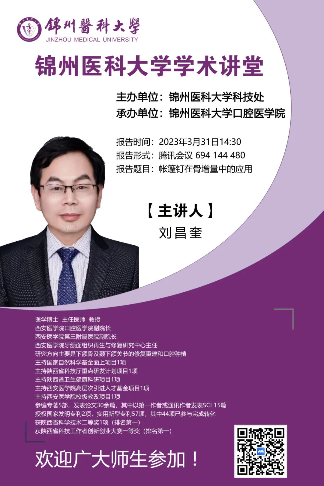 为营造学术氛围,加强学术交流,3月31日,由学校科技处主办,第一临床医学院、第三临床医学院、口腔医学院、人文与健康管理学院承办的学术讲堂如期举行,届时多名专家将为大家带来精彩的学术讲座,希望全校师生踊跃参加!