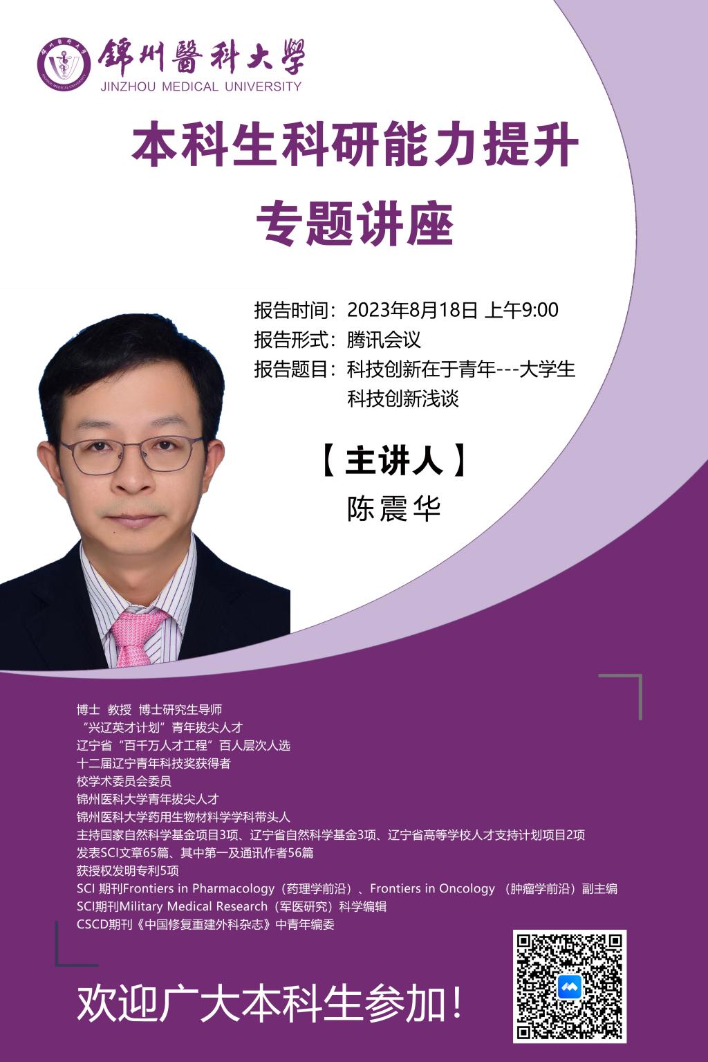 8月18日(本周五)上午9点,科技处特邀beat365优秀青年科技专家陈震华教授进行题目为“科技创新在于青年---大学生科技创新浅谈”的线上专题讲座,请各单位组织好本单位的本科生积极踊跃参加。