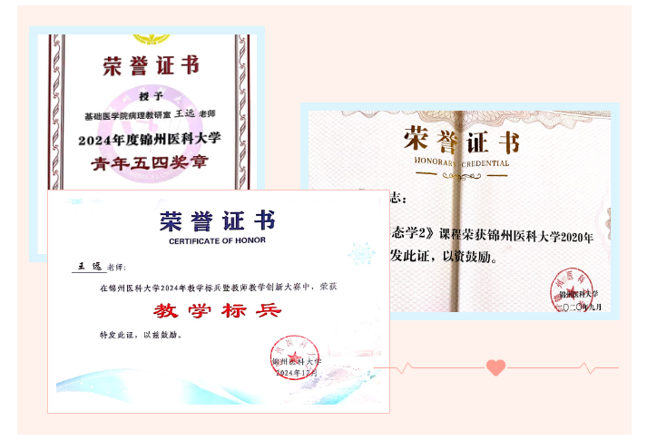 自2016年起,王远被聘为住院医师规范化培训导师,并多次获得医院“优秀带教老师”称号。2023年被医院聘为临床病理学规培基地“教学主任”,负责参与临床病理学及其他学科的规培教学工作。同时,她担任妇科病理亚专科负责人,为推动科室专业化发展做出了积极贡献。